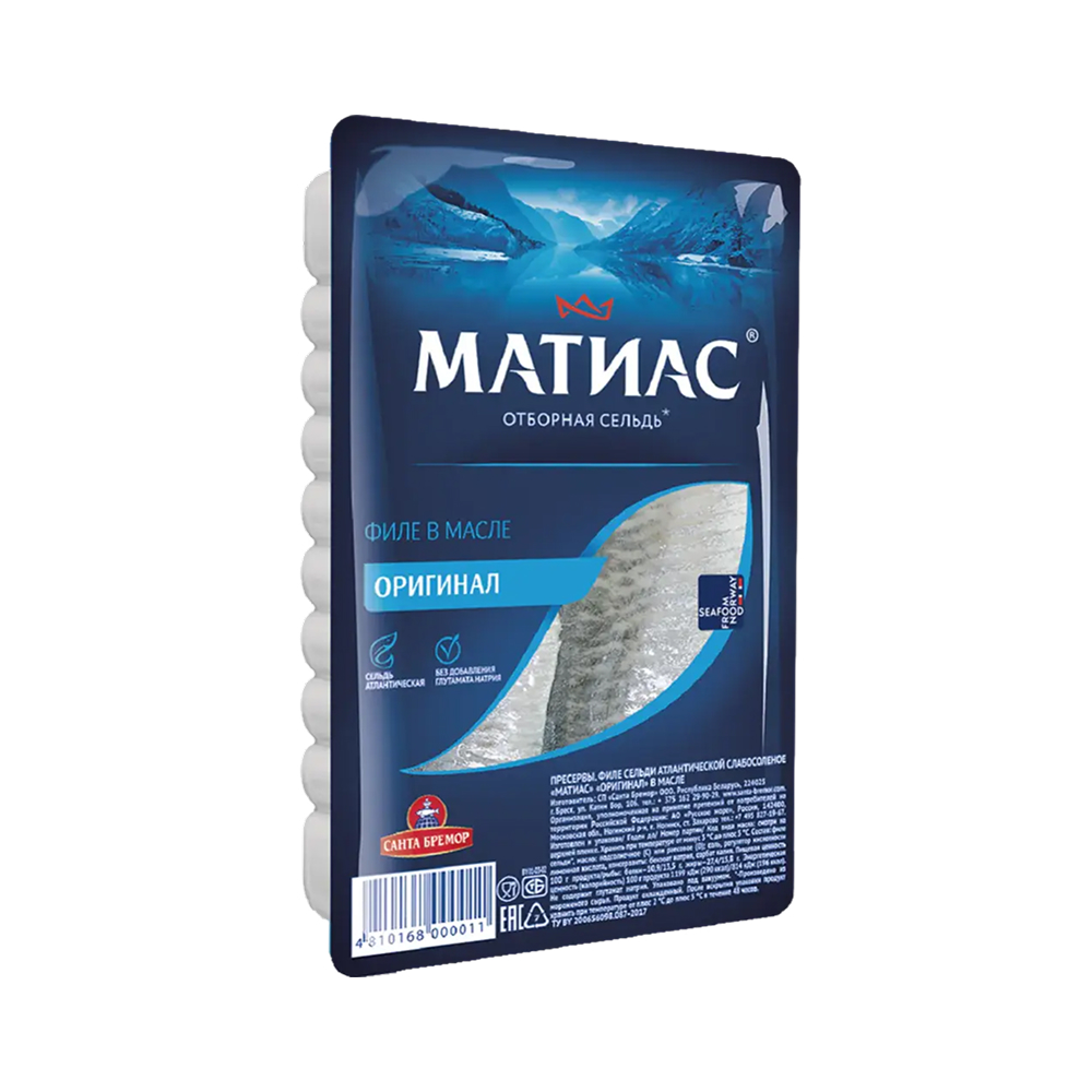 Сельдь Матиас — это премиальное филе сельди, приготовленное по скандинавской технологии с выдержкой в слабосолёном рассоле и последующим погружением в ароматное масло. Отборное филе отличается нежной текстурой, чистым вкусом и отсутствием костей. Благодаря щадящей обработке, сельдь сохраняет сочность, натуральный вкус и высокую пищевую ценность.